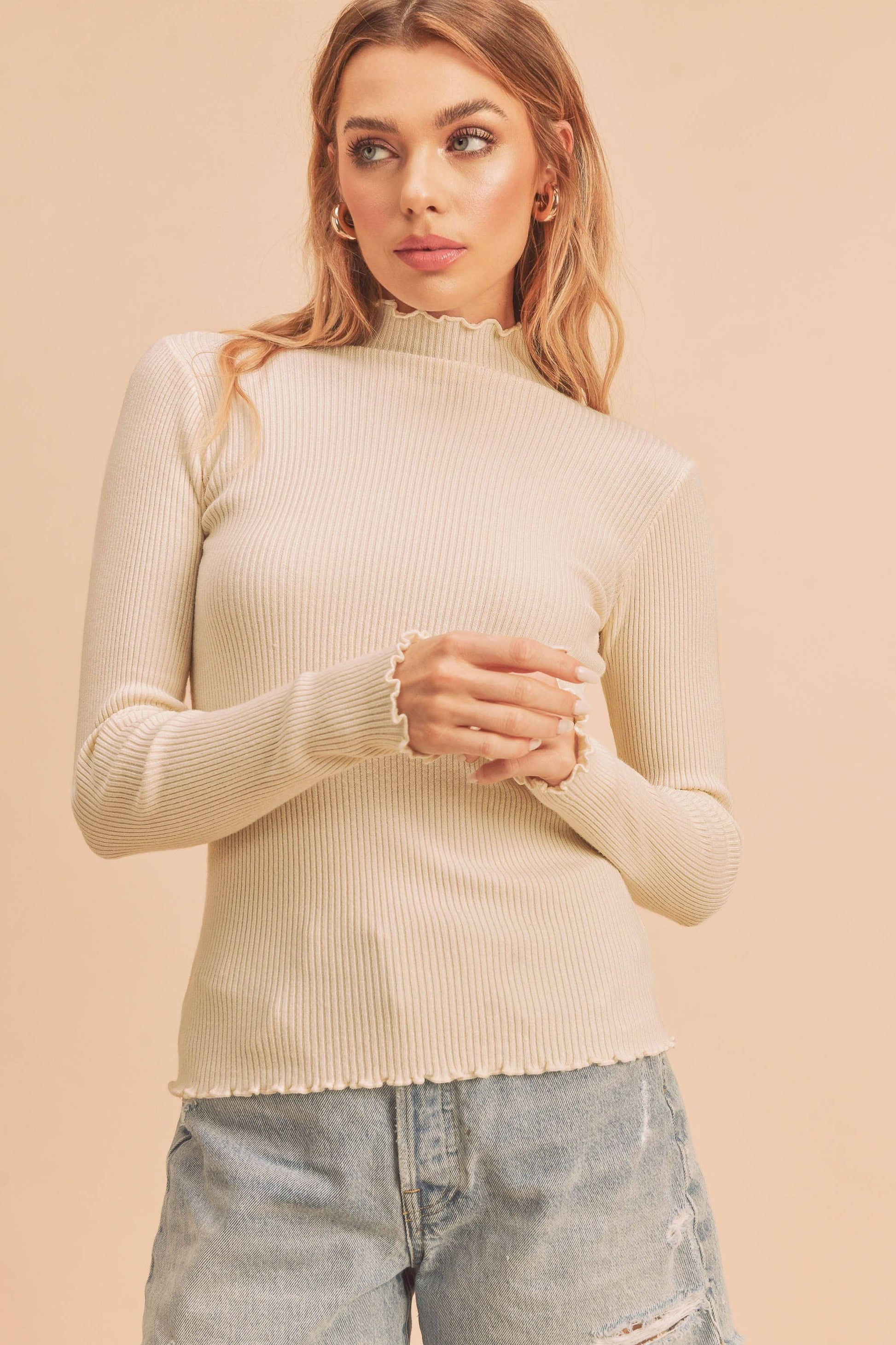 A classic sweater that is great for any occasion. Dress our Marcey mock neck sweater with lettuce hem detailing at the hem, neck and sleeves up with a skirt and boots, or pair it down with joggers, either way, you will be warm and cozy.