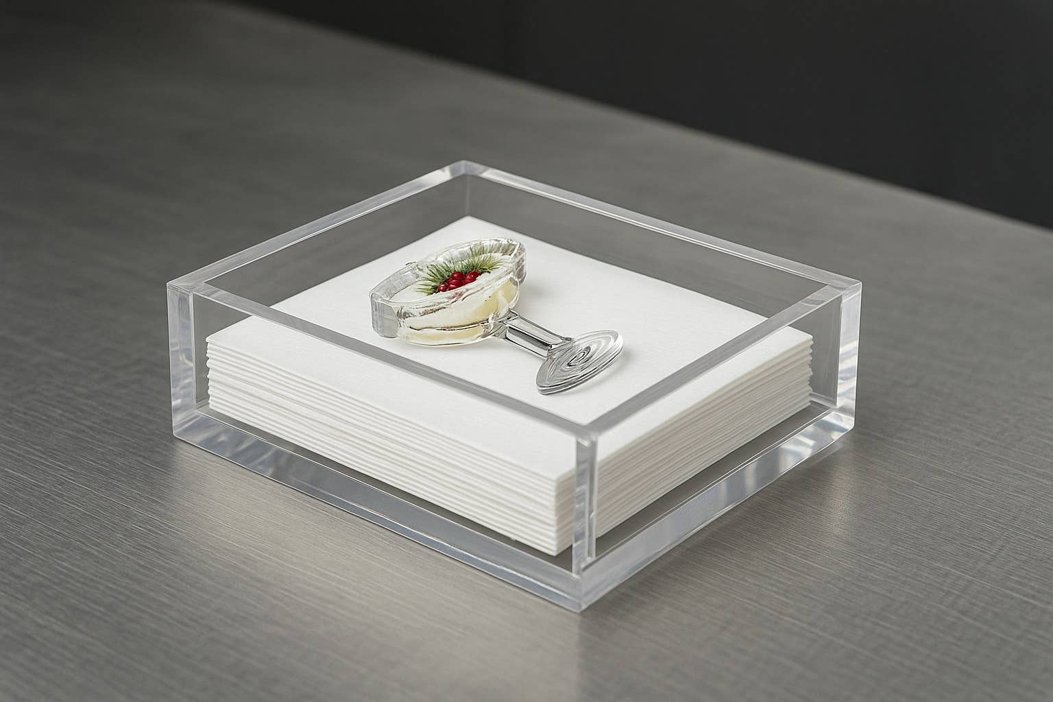 Toast to the season with this festive martini glass acrylic napkin weight that brings holiday cheer to every table. Hand-polished from premium crystal-clear lucite and measuring approximately 4"L × 1.5"W × 1"H, it keeps napkins perfectly anchored while adding a spirited touch to your bar cart or dining setup. Whether displayed during holiday entertaining or given as a thoughtful gift, it captures the joy of celebration in a piece that's both playful and timelessly elegant. Wipe clean and ready to make your gatherings merry.