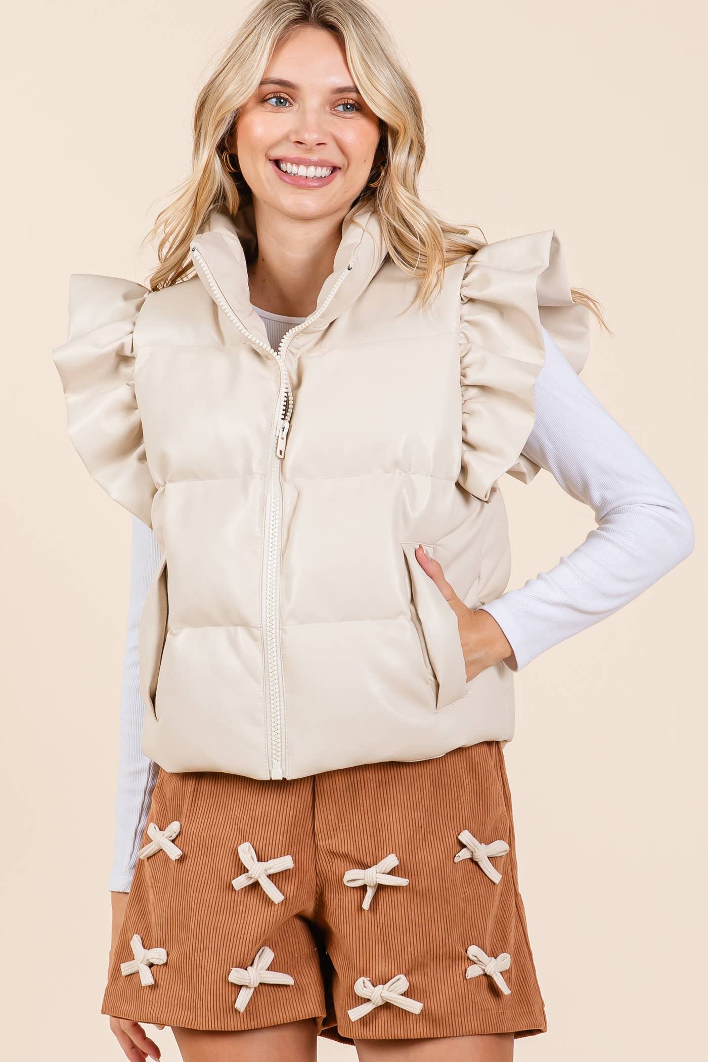 regular size, standard, contemporary, young contemporary, faux leather, solid, puffer vest, outerwear, sleeveless, ruffle trim by the sleeves, high mock neck, zipper front, side pockets, tiered, stylish, trendy, fashionable, chic, cute, warm, comfortable, daily wear, night out, outdoor, women's clothing, women's apparel, women's wear, fall, winter, fw