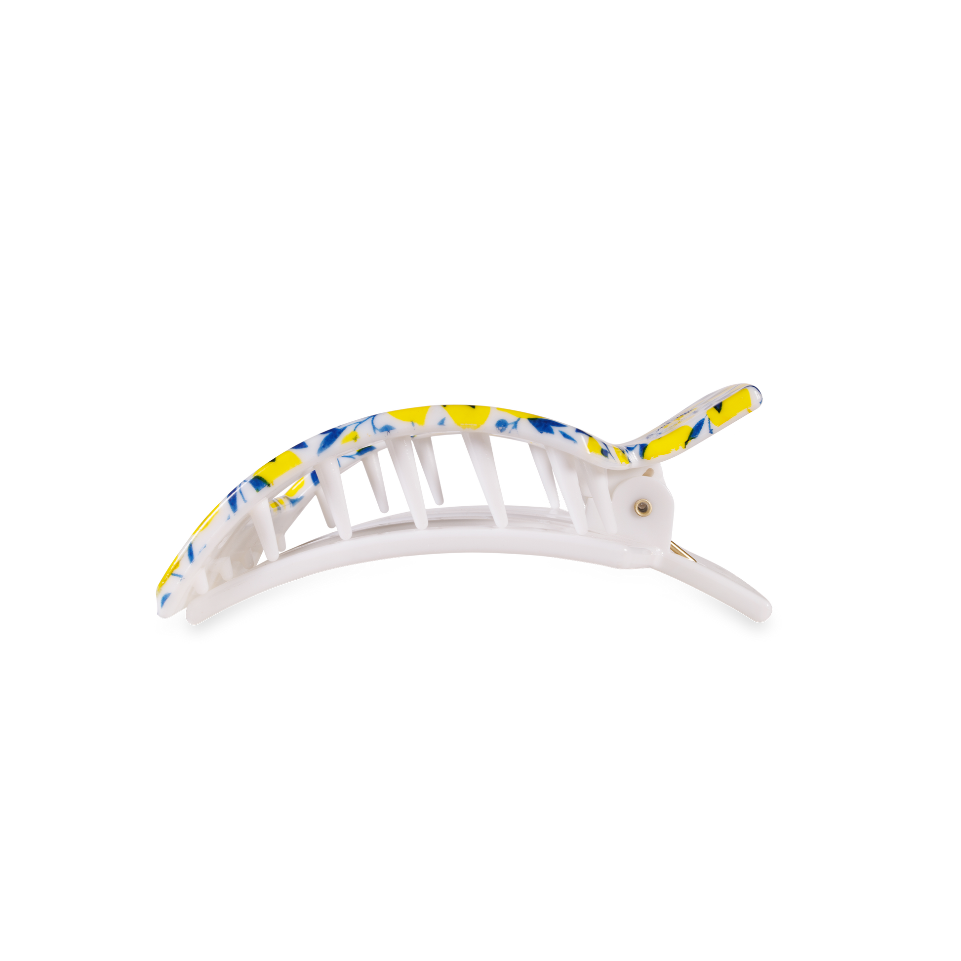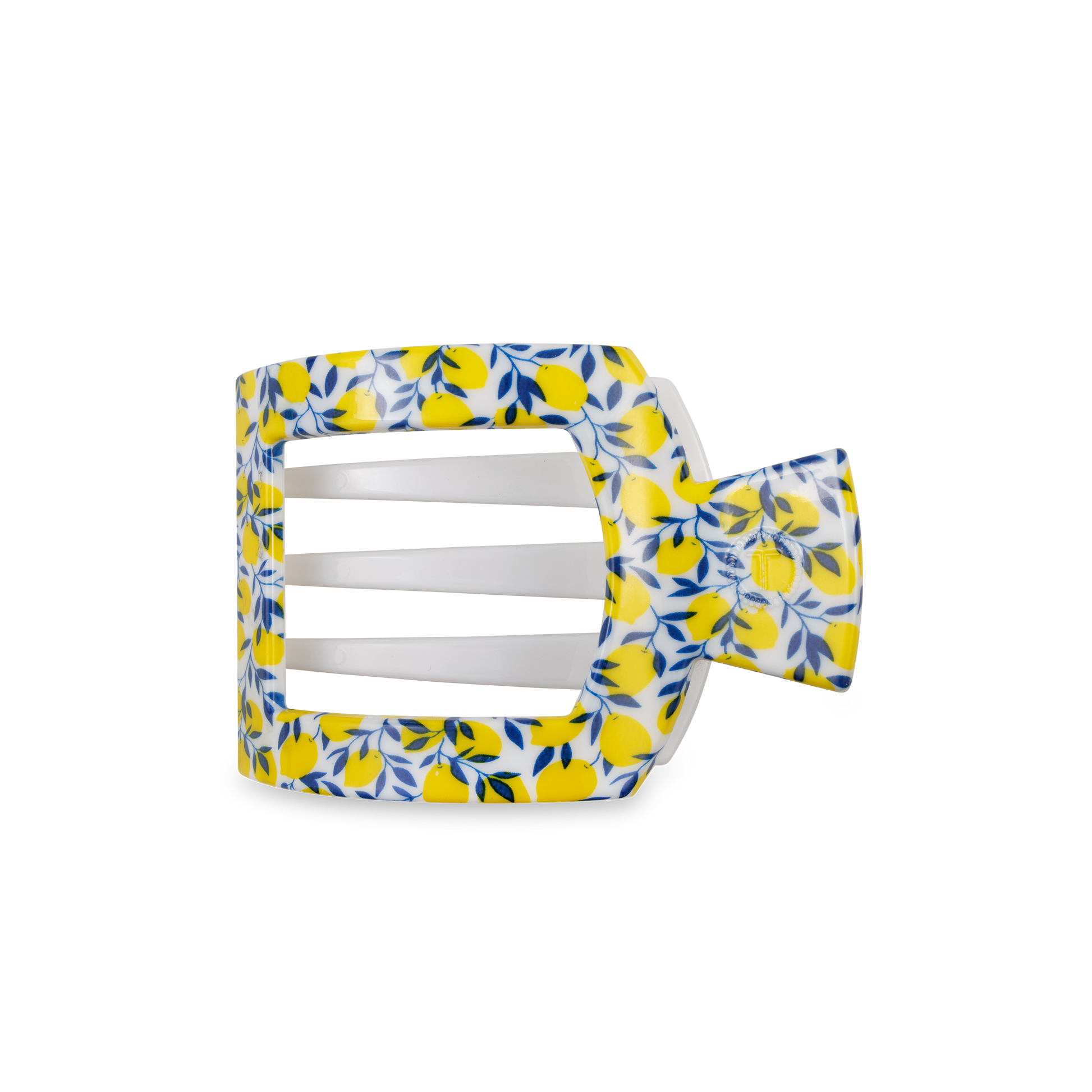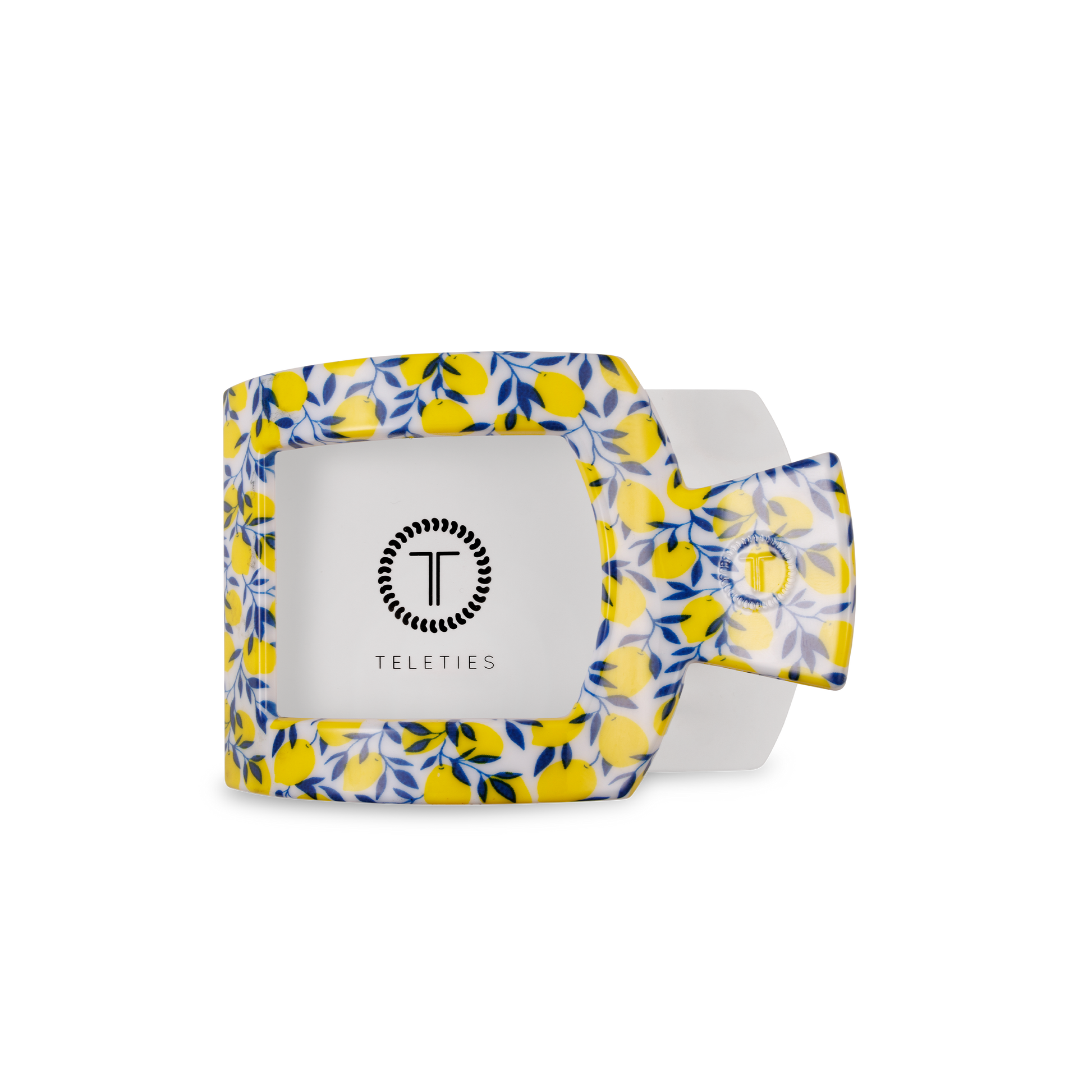 Lay flat and relax with the new TELETIES Limoncello Flat Square Hair Clip with a bold lemon print in yellow and blue. This hair clip is designed to allow you to lay back flat, do yoga, or sit comfortably in a seat with a headrest, and it is made with the same material that is nearly unbreakable.