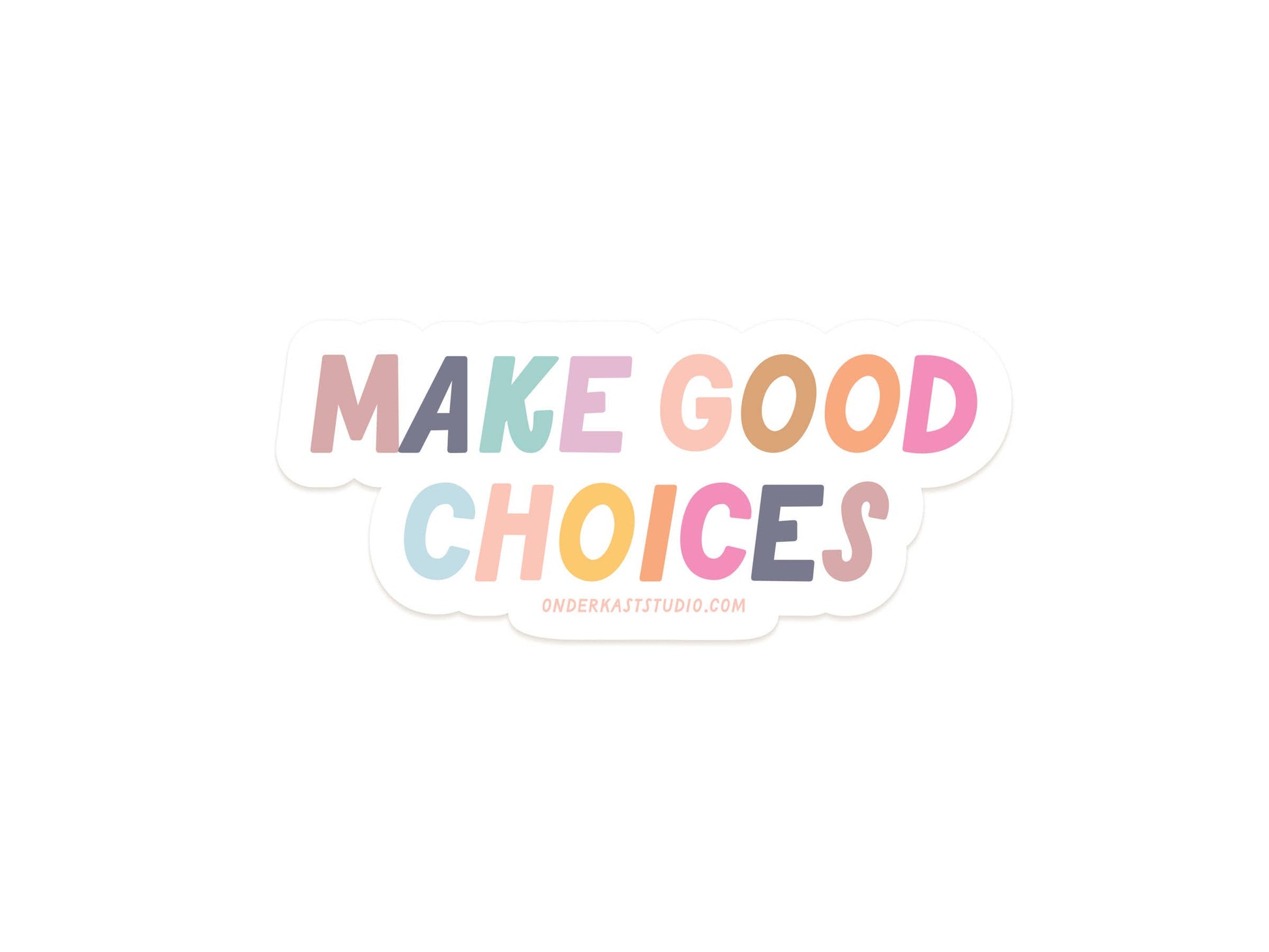 This playful "Make Good Choices" sticker measures 2.75” x 1.25" and is crafted from thick, weatherproof vinyl with a matte finish for a premium feel and lasting durability. The vibrant colors stand out, making the design bright and eye-catching. It comes unpackaged, ready to stick wherever you like right away. Proudly printed in the USA, it’s a fun little reminder to keep things on the right track!
