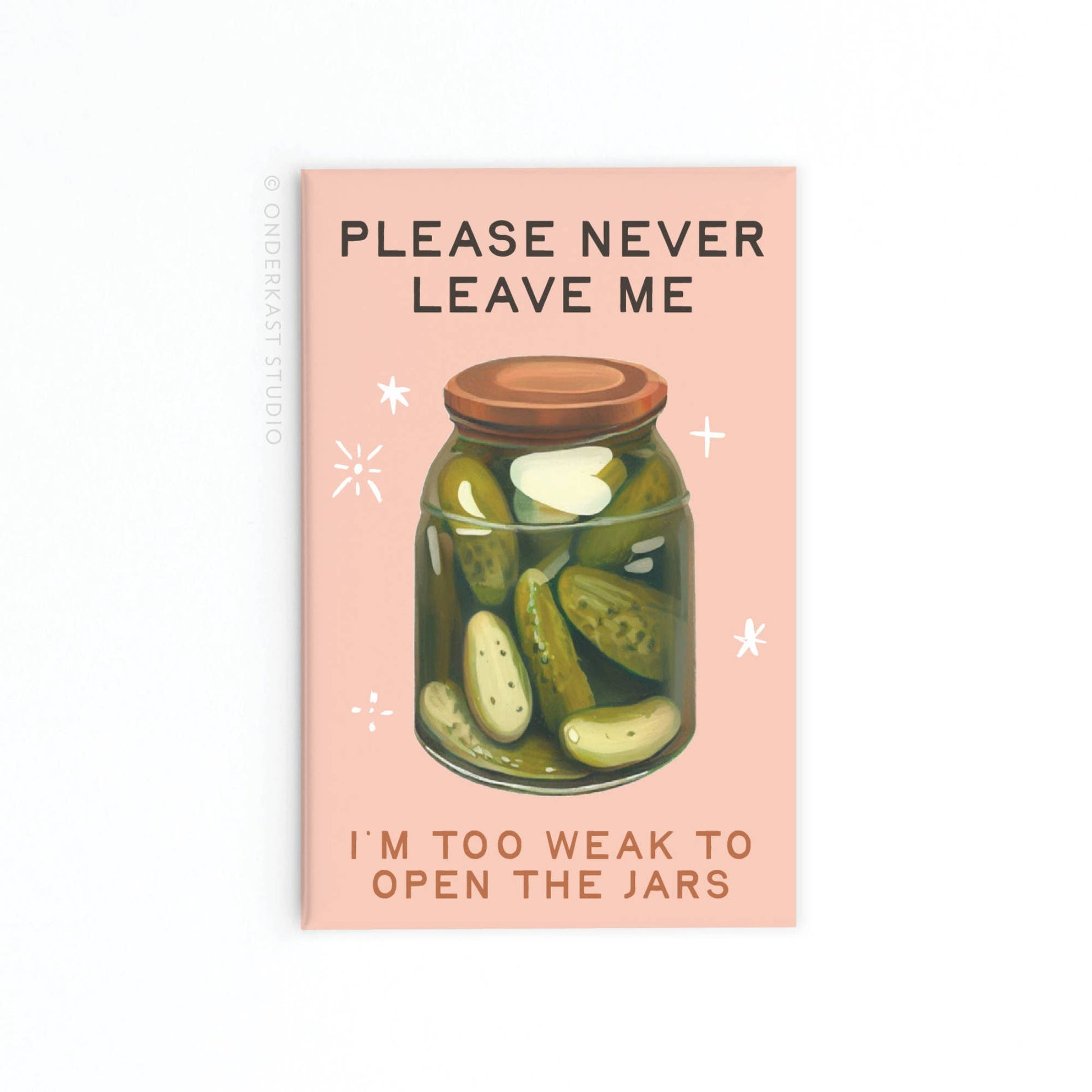 This playful "Never Leave Me Pickles" rectangular magnet measures 2" x 3" and features a sturdy metal shell with a flat magnetic backing. The front is protected by a clear mylar layer, showcasing vibrant, eye-catching colors. It comes unpackaged, ready to brighten up any magnetic surface right away. Proudly printed and hand-assembled in the USA, it’s a fun addition to your fridge or any metal spot!