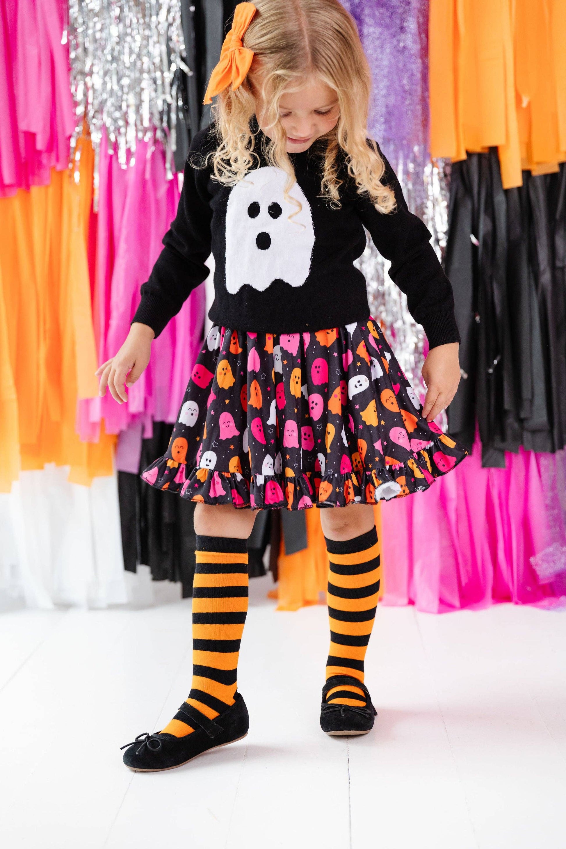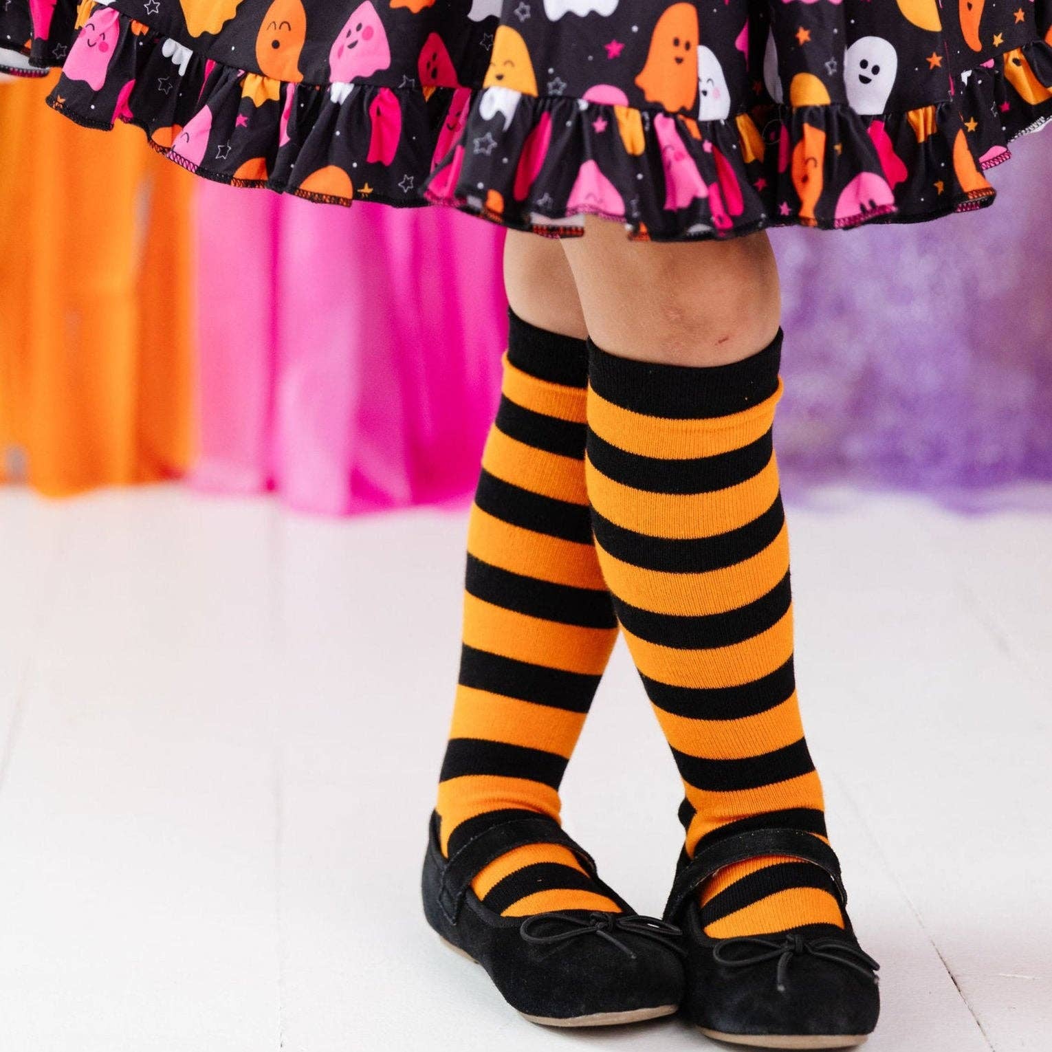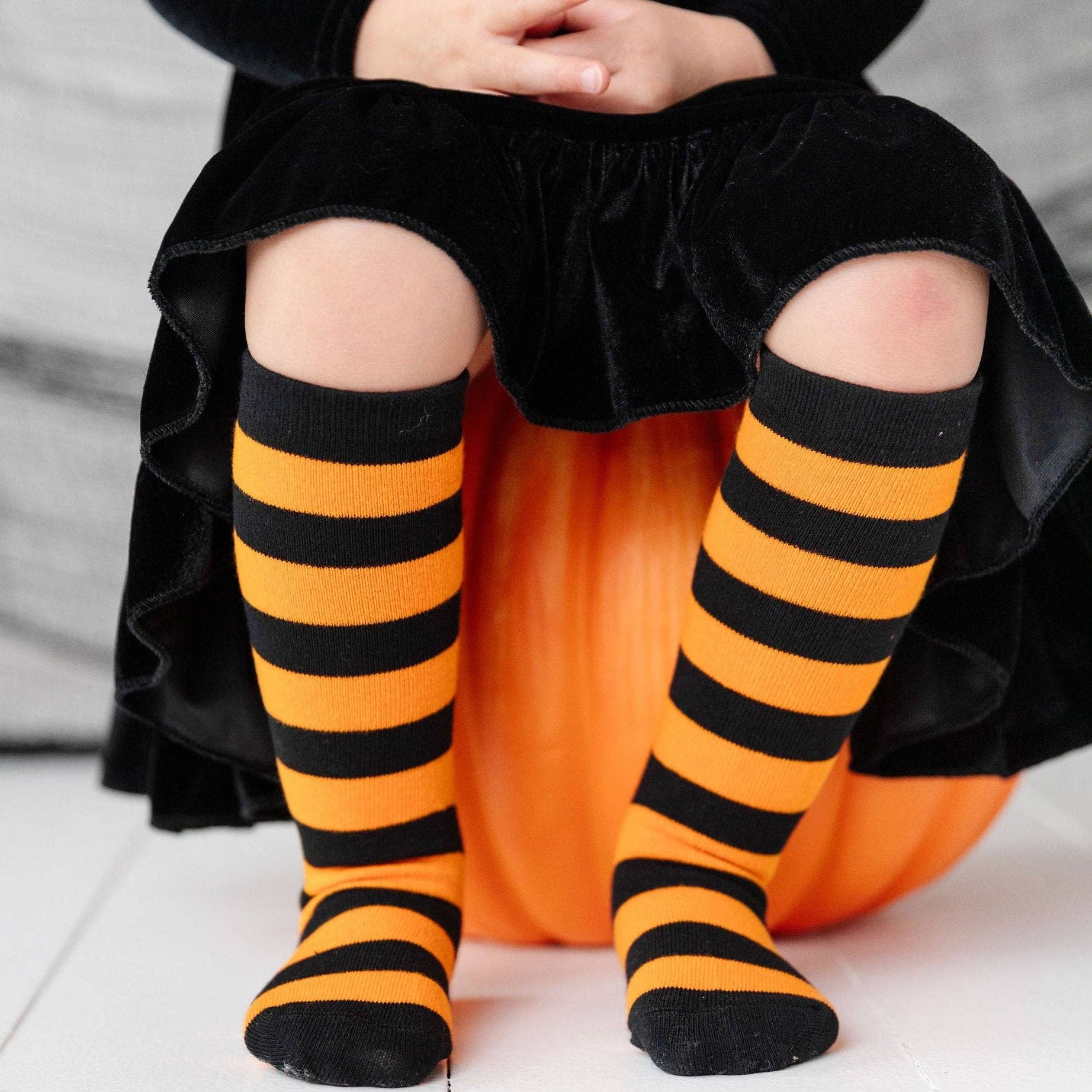 Classic orange and black horizontal striped socks will compliment all of her looks this spooky season!